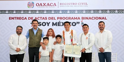 Oaxaca de Juárez, Oax. 25 de noviembre de 2025.- El Gobernador Salomón Jara Cruz entregó actas de nacimiento del programa Binacional “Soy México” a hijas e hijos de oaxaqueñas y oaxaqueños que nacieron en Estados Unidos, con el objetivo de que ejerzan sus derechos de manera plena en el país.