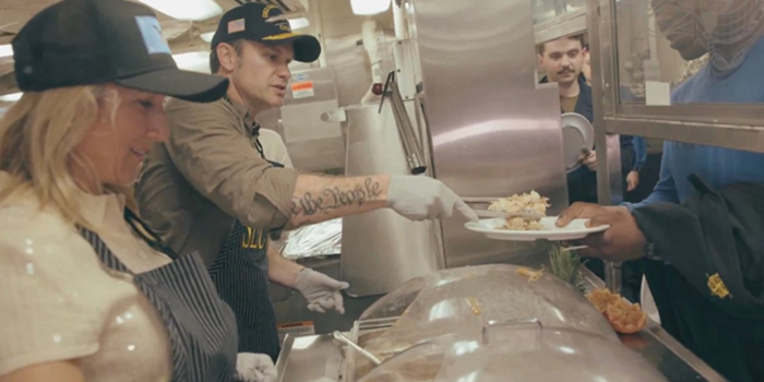 El Pentágono publicó un video en el que se ve a Hegseth mientras habla con un megáfono para desear a todos los que están a bordo un feliz Día de Acción de Gracias y posteriormente sirvió comida a los efectivos.