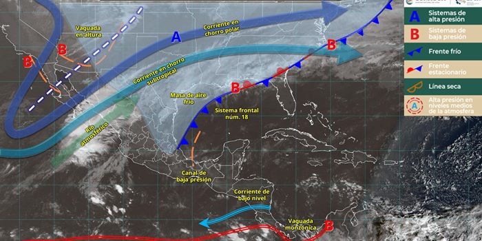 SMN/ 677| Ciudad de México a 05 de Diciembre del 2025 06:00h. Este día, el sistema frontal núm. 18 se extenderá con características de estacionario sobre el noreste y oriente de la República Mexicana, el abundante ingreso de humedad proveniente del océano Pacífico asociado con un río atmosférico y una vaguada en niveles medios y altos de la atmósfera sobre el noroeste de México, ocasionarán lluvias y chubascos en las regiones mencionadas, con lluvias puntuales fuertes en Baja California Sur, Sinaloa, Durango, Zacatecas, Nayarit y Jalisco; además de probable caída de nieve o aguanieve en sierras de Sonora, Sinaloa, Durango y Chihuahua.