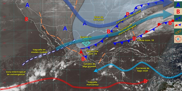 A su vez, canales de baja presión en el interior del país, en combinación con el ingreso de humedad del océano Pacífico, ocasionarán lluvias e intervalos de chubascos en zonas del occidente y sur de la República Mexicana; y lluvias puntuales fuertes en Guerrero.