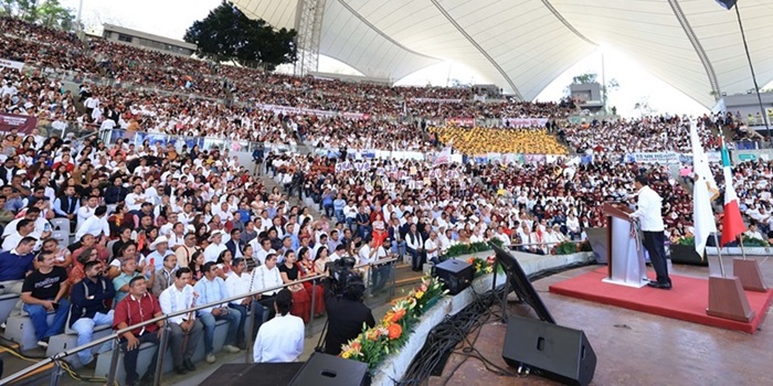 Ante más de 12 mil personas concentradas en el Auditorio Guelaguetza, el Mandatario estatal destacó junto a la Presidenta Honoraria del Sistema DIF Oaxaca, Irma Bolaños Quijano, que se han realizado de manera directa en las comunidades, diversas acciones en el campo, salud, educación y seguridad; sin endeudar al Estado.