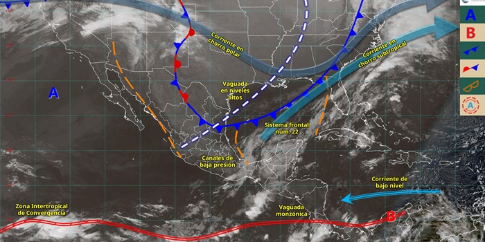 SMN/ 705|Ciudad de México a 19 de Diciembre del 2025 06:00h. Para hoy, el sistema frontal núm. 22 se extenderá sobre el norte del golfo de México y noreste del país, en interacción con una vaguada en niveles altos de la atmósfera extendida desde el noreste hasta el occidente de México y con un canal de baja presión sobre el occidente del golfo de México y el sureste del territorio nacional ocasionarán lluvias puntuales intensas en Chiapas (norte y este), Tabasco (sur y este) y Campeche (centro y suroeste); lluvias fuertes a muy fuertes en zonas de Veracruz (Papaloapan, Los Tuxtlas y Olmeca), Oaxaca (norte y este), Yucatán y Quintana Roo, así como lluvias con chubascos en zonas del noreste, oriente, centro, sur y sureste del país.