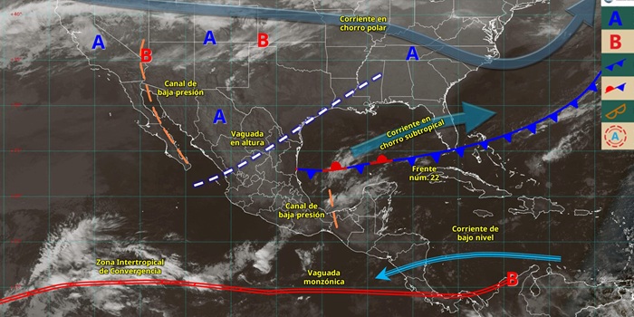 Finalmente, un anticiclón en niveles medios de la atmósfera se posicionará sobre el noroeste mexicano y propiciará tiempo estable y sin lluvia sobre entidades del norte, noroeste y occidente del territorio nacional, así como el incremento de las temperaturas máximas en esas regiones.