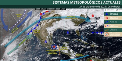 Por otra parte, se mantiene en vigilancia el frente frío número 24, que se desplazará sobre el noroeste de la República Mexicana, por lo que es muy probable que sus efectos se dejen sentir sobre la entidad a partir del lunes por la tarde, con mezclas invernales de lluvia, baja temperatura y viento fuerte.