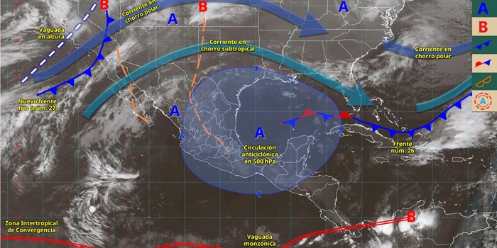 SMN/009| Ciudad de México a 05 de Enero del 2026 06:00h. En el transcurso de este día, el frente núm. 26 adquirirá características cálidas y se desplazará hacia el sur de Estados Unidos, dejando de afectar al territorio nacional. Simultáneamente, el nuevo frente frío (núm. 27) ingresará sobre el noroeste del país, en combinación con las corrientes en chorro polar y subtropical, además de una vaguada en niveles altos de la atmósfera, propiciarán rachas de viento de 30 a 50 km/h y descenso de temperatura en la región mencionada, así como chubascos en Baja California. A su vez, el ingreso de humedad del océano Pacífico y mar Caribe ocasionará lluvias y chubascos en zonas de Guerrero, Oaxaca, Michoacán, Chiapas y Quintana Roo.
