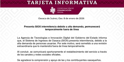 La Agencia de Tecnologías e Innovación Digital del Gobierno del Estado informa que, el Sistema de Ingresos de Oaxaca (SIOX) presenta intermitencia, debido a la alta demanda de personas usuarias. Por este motivo, será sometido a una revisión extraordinaria que lo mantendrá fuera de línea temporalmente.