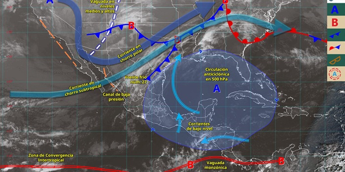A su vez, el ingreso de humedad del océano Pacífico, golfo de México y mar Caribe generará lluvias y chubascos en Michoacán, Guerrero, Quintana Roo, Hidalgo, Puebla, Veracruz, Chiapas, Campeche y Yucatán. Por otra parte, una circulación anticiclónica en niveles medios de la atmósfera mantendrá cielo mayormente despejado y baja probabilidad de lluvia en el resto de la República Mexicana.