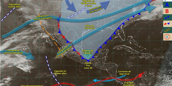 Para hoy, el frente frío núm. 30 se desplazará sobre el sur del golfo de México, sureste del país y la península de Yucatán, propiciará lluvias fuertes a muy fuertes en dichas regiones; pronosticándose lluvias puntuales intensas a torrenciales en Veracruz, Tabasco, Oaxaca y Chiapas. Simultáneamente, la masa de aire ártico asociada al sistema frontal, mantendrá el ambiente frío y bancos de niebla sobre entidades del norte, centro, oriente y sureste del país; así como ambiente muy frío a gélido en zonas serranas de la Mesa del Norte. Además de evento de “Norte” muy fuerte a intenso en el litoral del golfo de México, la península de Yucatán, istmo y golfo de Tehuantepec.