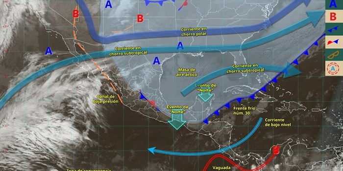 Así mismo, persistirá el evento de “Norte” con rachas de viento de 90 a 110 km/h en el istmo y golfo de Tehuantepec; de 60 a 80 km/h en Veracruz; de 50 a 70 km/h en Quintana Roo; y rachas de 40 a 60 km/h en Tamaulipas, Tabasco, Campeche y Yucatán. También, se pronostica oleaje de 4.0 a 5.0 metros de altura en el golfo de Tehuantepec; y de 3.0 a 4.0 metros de altura en las costas de Veracruz, Tabasco, Campeche, Yucatán y Quintana Roo.