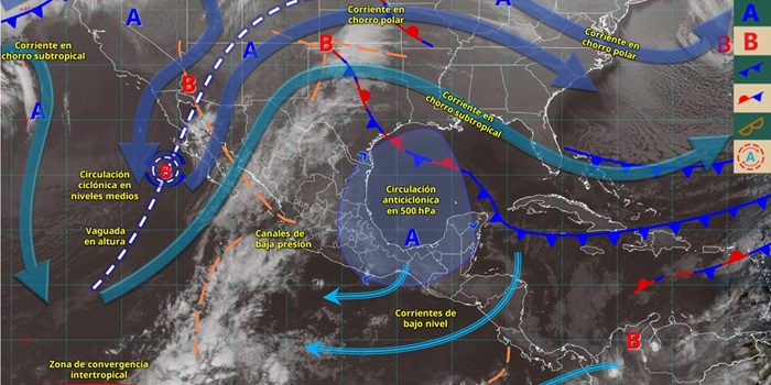 Además, prevalecerá el oleaje elevado en costas del Pacífico mexicano por mar de fondo. Finalmente, continuará un anticiclón en niveles medios de la atmósfera, manteniendo tiempo estable y ambiente cálido a caluroso en gran parte del territorio nacional, con temperaturas nocturnas y matutinas de frías a muy frías en zonas serranas de la Mesa del Norte y Mesa Central.