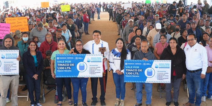 Santa Cruz Xoxocotlán, Oax., 28 de feb. — Como parte del programa estatal «Agua para Todos», el gobernador Salomón Jara Cruz y la presidenta municipal de Xoxocotlán, Nancy Benítez Zárate, entregaron mil 100 tinacos para beneficiar a igual número de familias en el aprovechamiento del vital líquido.