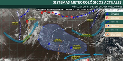 SMN/201 | Ciudad de México a 11 de Abril del 2026 06:00h. Este día, una vaguada en altura sobre el noroeste del territorio nacional, un canal de baja presión sobre la Mesa del Norte, una línea seca en el norte de México y la corriente en chorro subtropical, originarán lluvias puntuales fuertes, descargas eléctricas y posibles granizadas en el norte y noreste del país, además de lluvias puntuales muy fuertes en Coahuila (norte); así como rachas de viento, con posible formación de torbellinos en Chihuahua (este y noreste) y Coahuila…