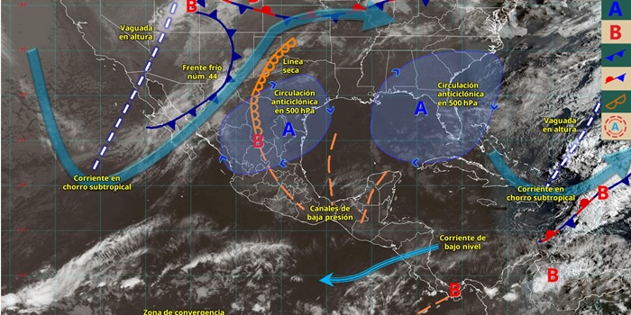 SMN/207|Ciudad de México a 14 de Abril del 2026 06:00h. Para hoy, el frente frío núm. 44 prevalecerá sobre el noroeste del país e interaccionará con una vaguada en altura, con la corriente en chorro subtropical y con una línea seca en el norte del territorio mexicano, lo que ocasionará lluvias puntuales fuertes en Coahuila (norte); y chubascos en Chihuahua, Nuevo León y Tamaulipas. Dichas lluvias podrían estar acompañadas con descargas eléctricas y posible caída de granizo; además, se prevén lluvias aisladas en zonas de Sonora, Durango, Zacatecas y San Luis Potosí. Viento con rachas 70 a 90 km/h en Sonora, acompañadas de posible formación de torbellinos en Chihuahua (noreste); y viento de 30 a 40 km/h con rachas de 50 a 70 km/h y posible formación de torbellinos en Coahuila (norte), Nuevo León (norte) y Tamaulipas (noroeste). Por otra parte, canales de baja presión en el interior y sureste de la República Mexicana, y el ingreso de aire húmedo del océano Pacífico, golfo de México y mar Caribe, generarán lluvias y chubascos con descargas eléctricas en estados del oriente, centro, sur y sureste del territorio nacional, incluido el Valle de México. Finalmente, se mantendrá la onda de calor en zonas de Sinaloa (norte, centro y sur), Nayarit (norte y sur), Jalisco (oeste y sur), Colima (este y sur), Michoacán (centro y oeste), Guerrero (noroeste, este y sur), Morelos (sur), Puebla (suroeste) y Oaxaca (sur).