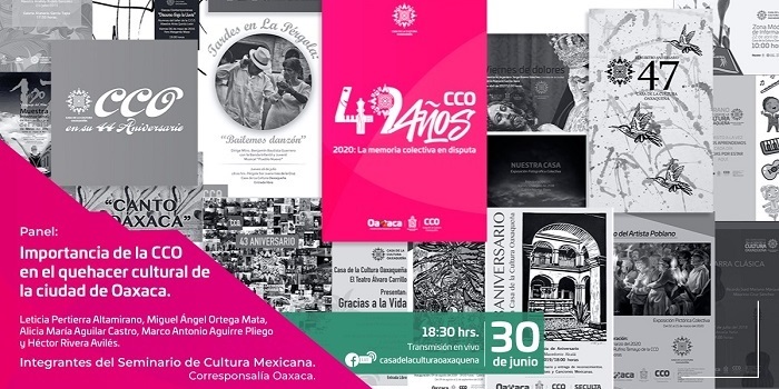 Este martes se transmitirá en vivo el panel “Importancia de la CCO en el quehacer cultural de la ciudad de Oaxaca”, a través de la página de Facebook de la dependencia, a las 18:30 horas. Oaxaca de Juárez, Oax. 30 de junio de 2020. El Seminario de Cultura Mexicana (SCM) corresponsalía Oaxaca, se suma a la celebración del 49 aniversario de la Casa de la Cultura Oaxaqueña (CCO), con su participación en un panel sobre el quehacer cultural de la institución. El SMC encontró en la Casa de la Cultura…