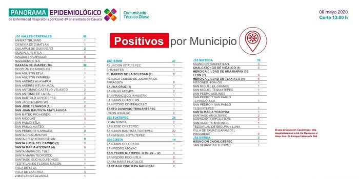 Oaxaca de Juárez, Oax. 6 de mayo de 2020.- La subdirectora de Innovación y Calidad de los Servicios de Salud de Oaxaca (SSO), Rosa Lilia García Kavanagh, informó que de acuerdo al comunicado técnico diario de este miércoles 6 de mayo, se han contabilizado 202 casos positivos de COVID-19 en la entidad. La funcionaria señaló que en 24 horas se registraron 17 nuevos casos positivos y lamentablemente cuatro fallecimientos más, sumando 31 decesos en todo el estado a consecuencia de este virus. Del total de muertes, 22 han sido en…