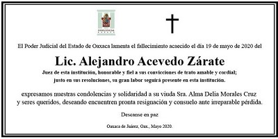 Diana Manzo, corresponsal |La Jornada|Foto @tsjoaxaca| miércoles, 20 may 2020 13:25. Juchitán, Oax. Alejandro Acevedo Zárate, juez de control del juzgado en Salina Cruz, Oaxaca falleció la noche de ayer miércoles, a consecuencia de complicaciones a su salud generadas por el virus del Covid-19, informaron sus familiares. Acevedo Zárate, de 40 años de edad había sido internado en un hospital particular, en donde su estado de salud se agravó, se encontraba intubado pero finalmente falleció. Su hermano Rogelio Acevedo lo recordó como una persona valiosa para la familia y la sociedad…