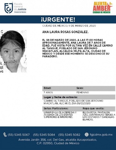La Fiscalía de la Ciudad de México activó la Alerta Amber para localizar a la pequeña Ana Laura Rosas González. 09/03/2020 17:19 REDACCIÓN|Excélsior|CIUDAD DE MÉXICO. La Fiscalía de la Ciudad de México activó la Alerta Amber para localizar a Ana Laura Rosas González, de 7 años de edad. La menor de edad desapareció el día 8 de marzo de 2020 en Poblado de San Jerónimo Miacatlán, alcaldía Milpa Alta. La Fiscalía Especializada en la Búsqueda, Localización e Investigación de Personas Desaparecidas, recibió la solicitud de activación de Alerta y emitió el boletín de búsqueda, con la leyenda…