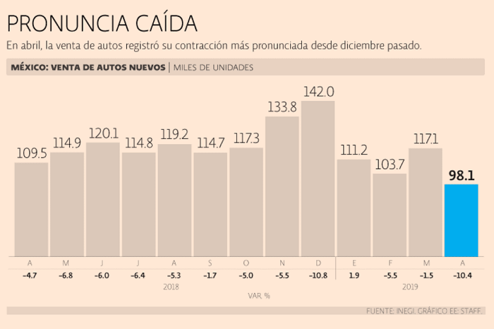 Las ventas de automóviles ligeros ascendieron a 98,105 unidades durante el cuarto mes del 2019. Este es el peor resultado desde abril del 2015. Ana Karen García/03 de mayo de 2019, 10:32. Durante el cuarto mes del año se vendieron 98,105 automóviles nuevos en el mercado nacional, esta es la peor cifra registrada desde abril del 2015 (94,953 unidades vendidas). Este es el primer mes en cuatro años en el que las ventas registran un nivel por debajo de las 100,000 unidades. Este resultado significó una caída de 10.4% en comparación…