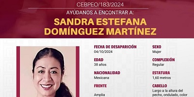 Se generaron mecanismos de coordinación interinstitucional que facilitarán la búsqueda de estas personas Oaxaca de Juárez, Oax. 10 de octubre de 2024.- La Comisión Estatal de Búsqueda de Personas Desaparecidas para el Estado de Oaxaca (CEBPEO) activó las acciones de búsqueda inmediata de Sandra Estefana Domínguez Martínez y Alexander Hernández Hernández, de 38 y 46 años de edad respectivamente. Dichas personas fueron vistas por última vez el 4 de octubre de 2024, en María Lombardo de Caso, San Juan Cotzocón, Oaxaca, sin que hasta la fecha se conozca su paradero. Luego…