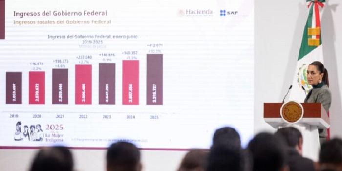 La presidenta Claudia Sheinbaum informó este viernes que los ingresos del Gobierno Federal aumentaron 10.3% durante el primer semestre de 2025, en comparación con el mismo periodo del año anterior. Por Yareth Arciniega Villa |Revista Fortuna | julio 4, 2025. De acuerdo con datos oficiales presentados en su conferencia matutina en Palacio Nacional, de enero a junio se registró uno recaudación fiscal de 3 billones 219 mil 727 millones de pesos, frente a los 2 billones 807 mil 656 millones obtenidos en el mismo lapso de 2024. Sheinbaum señaló que…