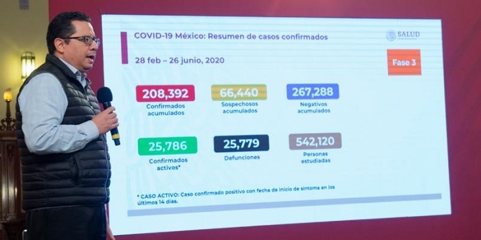 Este 26 de junio, la SSa fue notificada de 5 mil 441 nuevos contagios y 719 decesos por la nueva enfermedad. JUNIO 26, 2020 19:13 |SDPNoticias|Alexis Pavón|México.- La Secretaría de Salud (SSa) informó que México suma 25 mil 779 muertos y 208 mil 392 casos confirmados acumulados de coronavirus Covid-19. En la conferencia diaria de seguimiento del avance de la pandemia en territorio nacional, el director de Epidemiología de la SSa, José Luis Alomía, informó que este 26 de junio fueron notificados de 5 mil 441 nuevos contagios y 719 decesos. En total, el sistema de Salud en México ha revisado a…