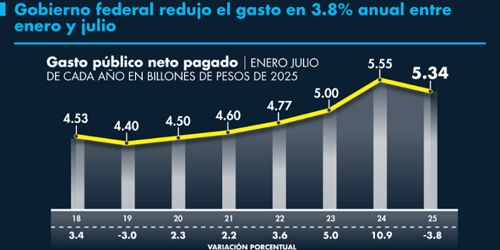 – Menor gasto a julio, entre recortes en salud, ambiente e infraestructura. – Entre enero y julio de este año, el gobierno federal ejerció 5 billones 337, 991 millones de pesos, lo que representó una caída de 3.8% anual. Por: Belén Saldívar| Gráfico EE | El Economista | 01.09.2025 – 02:11. La administración de Claudia Sheinbaum continuó con su consolidación fiscal, logrando reducir el déficit a costa de recortes al gasto en salud, protección ambiental, infraestructura, entre otros rubros, de acuerdo con la información a julio de la Secretaría de…