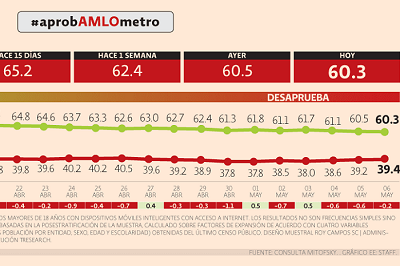 El 14 de abril —fecha de inicio de la medición— la gestión del presidente tuvo 67.8% de aprobación; ayer domingo se ubicó en 60.5 por ciento. Jorge Monroy/05 de mayo de 2019, 22:11. La aprobación del presidente Andrés Manuel López Obrador se ubica hoy en 60.3%, lo que significa 2 puntos porcentuales menos que hace una semana; 4 puntos y medio menos que hace dos semanas y 7 puntos porcentuales y medio menos que el 14 de abril, de acuerdo con el nuevo estudio “AprobAMLOmetro”, que diariamente elaborará Consulta Mitofsky para El Economista. El tracking poll indica…