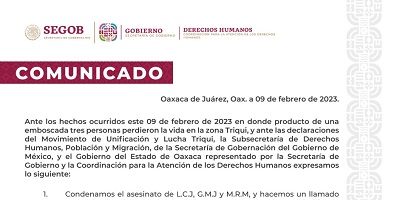 Oaxaca de Juárez, Oax. a 09 de febrero de 2023. Ante los hechos ocurridos este 09 de febrero de 2023 en donde producto de una emboscada tres personas perdieron la vida en la zona Triqui, y ante las declaraciones del Movimiento de Unificación y Lucha Triqui, la Subsecretaría de Derechos Humanos, Población y Migración, de la Secretaría de Gobernación del Gobierno de México, y el Gobierno del Estado de Oaxaca representado por la Secretaría de Gobierno y la Coordinación para la Atención de los Derechos Humanos expresamos lo siguiente: 1.- Condenamos…