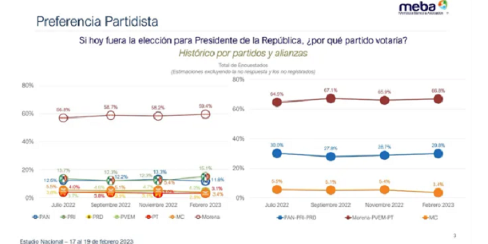 A 15 meses de que se lleve a cabo la próxima elección presidencial, Morena continúa a la delantera en la intención de voto. El Universal. Jorge Buendía y Javier Márquez. 01 de marzo 2023. Claudia Sheinbaum y Marcelo Ebrard encabezan las preferencias para abanderar a la coalición gobernante, mientras que Miguel Ángel Mancera y Beatriz Paredes son los aspirantes que cosechan más adhesiones en el bloque opositor. Lo anterior, de acuerdo con la más reciente encuesta nacional cara a cara en vivienda de Buendía & Márquez en exclusiva para EL UNIVERSAL. El…