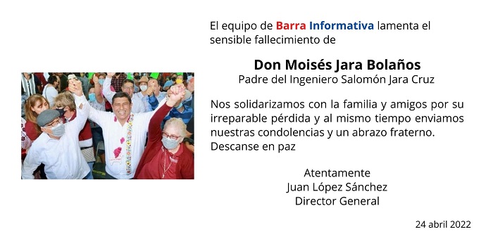 Barra Informativa se une a la pena que embarga a la familia y amistades por el fallecimiento de Don Moisés Jara Bolaños, padre del Ingeniero Salomón Jara Cruz. Reciban nuestras condolencias. Descanse en paz.