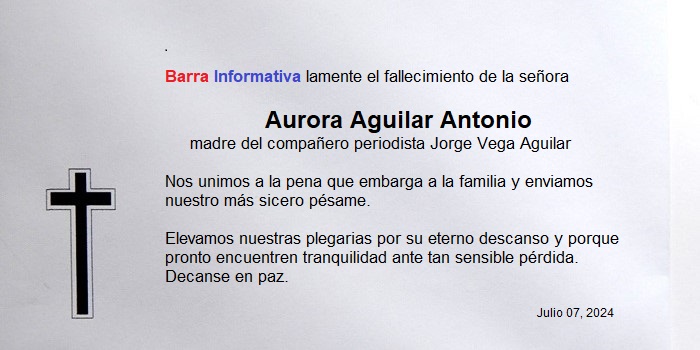 El equipo de Barra Informativa se une solidariza con la Familia Hernández López por el lamentable fallecimiento de su amada madre Doña Teodora Cristina López Fernández Externamos nuestras condolencias y enviamos un abrazo fraterno a la familia y amigos. Descanse en paz