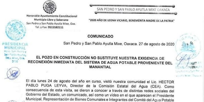 Redacción/Barra Informativa/Oaxaca, 29 de agosto 2020.- las autoridades de San Pedro y San Pablo Ayutla, Mixes, Oaxaca, difunde un comunicado donde exigen al gobierno estatal, se cumpla la resolución judicial para que se reconecte el sistema de agua potable que tenían en 2017, cuando fue desconectado y destruido por la comunidad de Tamazulapam. Asimismo, señalan que la construcción de un pozo no sustituye su demanda ni la resolución mencionada, por lo cual piden se cumpla la resolución de manera inmediata. Subrayan que su derecho al agua no está sujeto a…