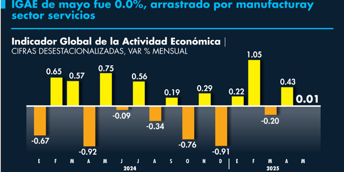 La actividad económica en México reportó, en mayo pasado, un crecimiento nulo, de acuerdo con la información divulgada la mañana de este martes por el Instituto Nacional de Estadística y Geografía (Inegi). Por: Belén Saldívar| Gráfico EE |El economista | 23.07.2025 – 02:39. La actividad económica en México reportó, en mayo pasado, un crecimiento nulo en su comparación mensual, de acuerdo con la información divulgada por el Instituto Nacional de Estadística y Geografía (Inegi). El reporte del Indicador Global de la Actividad Económica (IGAE), que da un seguimiento mensual a la…