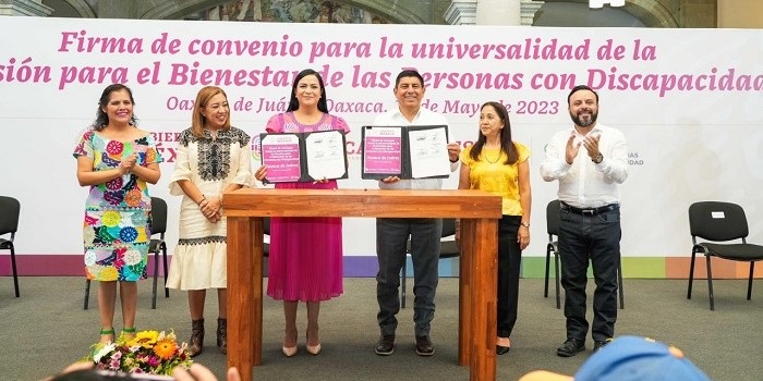El Gobernador Salomón Jara Cruz y la secretaria de Bienestar del Gobierno Federal, Ariadna Montiel Reyes firmaron el Convenio para la incorporación a la Universalidad de la Pensión para el Bienestar de las Personas con Discapacidad. -Los gobiernos Federal y Estatal aportan en partes iguales los recursos para cubrir el apoyo a 40 mil 33 oaxaqueñas y oaxaqueños con discapacidad. Oaxaca de Juárez, Oax. 10 de mayo de 2023.- El Gobierno de Oaxaca y la Federación aportan una inversión de 354 millones 292 mil 50 pesos para el bienestar de…