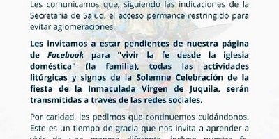 Las actividades litúrgicas se transmitirán a través de redes sociales. Por Guadalupe Espinoza|12 noviembre, 2020|Marca|Oaxaca, Oax.- Derivado de la contingencia de la Covid 19 el santuario diocesano de la reconciliación y de la paz de la inmaculada virgen de Juquila exhorta a los fieles católicos a no realizar su peregrinación al santuario. Mediante un comunicado pidieron a los fieles católicos seguir posponiendo sus peregrinaciones a santuario que año con año se realizan en estas fechas y durante el mes de diciembre. Lo anterior, puesto que estamos viviendo una contingencia sanitaria y…