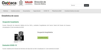 Presentan evolución de la pandemia, casos en población indígena y en embarazadas. Oaxaca de Juárez, Oax. 3 de noviembre de 2020.- Los Servicios de Salud de Oaxaca (SSO), incorporaron a la plataforma https://coronavirus.oaxaca.gob.mx/, estadísticas sobre el histórico de ocupación hospitalaria, evolución de la emergencia sanitaria, camas de reconversión, así como casos de COVID-19 en población indígena y embarazadas. Así lo informó el subdirector general de la dependencia, Juan Carlos Márquez Heine, quien destacó que en el micrositio https://dam.salud-oaxaca.gob.mx/estadistica-de-casos/ la ciudadanía podrá revisar de forma interactiva graficas que muestran el total de casos positivos, negativos,…