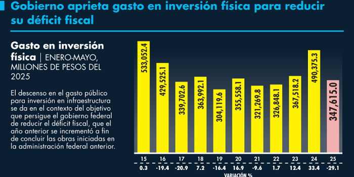 Sólo en el quinto mes del año los recursos sumaron 64,107 millones de pesos, 54.4% menos a tasa anual. Por: Belén Saldívar| Gráfico EE | El Economista |22.07.2025 – 02:37. Al igual que diversos rubros del gasto público, la inversión en infraestructura fue afectada por los recortes que se hicieron este año para lograr la consolidación fiscal, por lo que a mayo de este año cayó como nunca, de acuerdo con los datos divulgados por la Secretaría de Hacienda y Crédito Público (SHCP). El Informe de Finanzas Públicas y la…