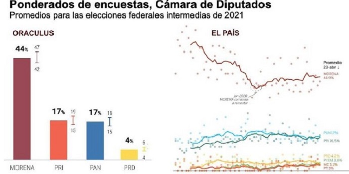A mes y medio de las elecciones del 6 de junio, los ponderados de El País y Oraculus perfilan que el partido fundado por Andrés Manuel López Obrador se quedará con la mayoría de San Lázaro, con lo que el proyecto del Gobierno federal podría avanzar en la segunda mitad del sexenio. Por Redacción| Ciudad de México, 25 de abril 11:00am (SinEmbargo).– A seis semanas de que millones voten en las cruciales elecciones federales intermedias (las del domingo 6 de junio), el oficialista Morena rebasa a los partidos Acción Nacional…