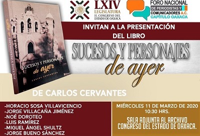 San Raymundo Jalpan, Oax. 10 de marzo de 2020.-El Congreso del Estado de Oaxaca será sede de la presentación del libro «Sucesos y Personajes de Ayer», un trabajo editorial compuesto por 243 páginas, autoría del periodista Carlos Cervantes, El evento se realizará este miércoles 11 de marzo, en punto de las 10:30 horas, en la sala adjunta al archivo del recinto legislativo. Carlos Cervantes, es uno de los exponentes de la prensa escrita en Oaxaca. Inició su carrera periodística en el año de 1965. A través de las páginas de…