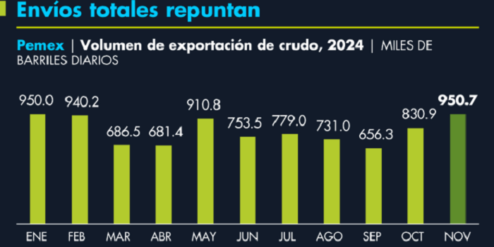 La petrolera envió un volumen promedio de 464,811 barriles diarios a dicho destino entre enero y noviembre, una caída anual de 35.4%; en paralelo, las ventas a la región de Europa (España y Portugal, principalmente) son las que registraron un mayor dinamismo pues crecieron 28% a 173,623 barriles por día. Por: Karol García|El Economista| lunes 30 de diciembre de 2024 – 12:30. Entre enero y noviembre, Petróleos Mexicanos (Pemex) exportó un promedio de 464,811 barriles diarios de petróleo crudo hacia Estados Unidos, su nivel más bajo en los últimos 35…