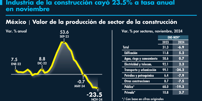 El indicador cayó 2.9% en comparación con octubre y acumuló cinco meses de descensos, a medida que se reduce el volumen de obra en proyectos insignia el gobierno pasado, como el Tren Maya; de forma acumulada se registra una contracción de 6.9%, que no fue mayor gracias a los crecimientos observados durante los dos primeros meses del 2024. Por: Alejandro de la Rosa| Gráfico EE |El Economista |lunes 27 de enero de 2025 – 00:32. Ni el Bachetón logró reactivar la industria de la construcción. El Instituto Nacional de Estadística…