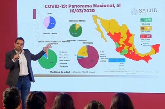 Autoridades de la Secretaría de Salud federal también informaron que el número de casos sospechosos de la nueva cepa de coronavirus se ubica en 171 16/03/2020 19:06 REDACCIÓN Y NOTIMEX|Excélsior|CIUDAD DE MÉXICO. Autoridades de la Secretaría de Salud federal (Ssa) informaron en conferencia de prensa que el número de casos confirmados de la nueva cepa de coronavirus (Covid-19) aumentó a 82 en México, 29 más de los que se tenían contabilizados hasta ayer domingo, de los cuales 43% son mujeres y el 57% son hombres. Mientras que el número de casos sospechosos de Covid-19 se…