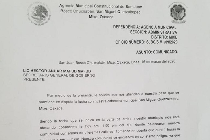 *El año pasado asesinaron a dos de sus paisanos Miguel Ángel Luna|Oaxaca, Oaxaca, 16 de en marzo de 2020 Ciudadanos y autoridades de San Juan Bosco Chuxnaban, Mixe piden la presencia del Ejército Mexicano tras la agresión que sufrieron esta tarde con disparos de arma de fuego realizado supuestamente por gente de la cabecera municipal que es San Miguel Quetzaltepec. En entrevista vía telefónica el agente municipal Isaías Zamora Ortiz, señaló que hasta las 20:30 horas no se han apersonado elementos de las fuerzas del orden, por lo que temen…