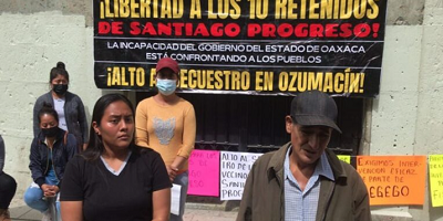 Demandas liberación de 10 retenidos en Ozumacín Yolanda| Redacción El Piñero | Corresponsalía| El Piñero |Oaxaca, Oax. septiembre 21, 2022, 2:52 pm- Cuatro mujeres iniciaron huelga de hambre indefinida en Palacio de Gobierno de Oaxaca, exigen liberación de 10 varones retenidos por autoridades de San Pedro Ozumacín; las victimas son de Santiago Progreso, localidad del municipio de Valle Nacional, región Cuenca. En conferencia de prensa realizada la tarde de este miércoles 21 de septiembre, en la Ciudad de Oaxaca, los familiares de los afectados señalaron que hoy se cumplen 20…