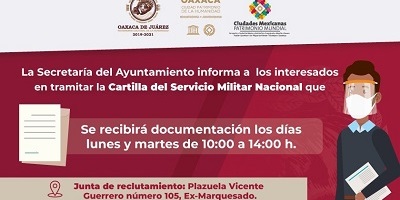 La documentación correspondiente se recibirá hasta el 16 de octubre, únicamente los días lunes y martes, en un horario de 10:00 a 14:00 horas. Oaxaca de Juárez, Oaxaca, a 11 de septiembre de 2020.- Como parte de las actividades para estimular el cumplimiento de los deberes cívicos entre la ciudadanía, el Ayuntamiento de Oaxaca de Juárez, a través de la Junta Local de Reclutamiento del Servicio Militar Nacional (SMN) de la Secretaría del Ayuntamiento, invita a la juventud capitalina nacida en el año 2002 y remisos a tramitar la cartilla del…