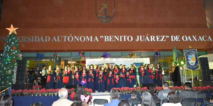 Oaxaca, Oax. 14 de diciembre del 2022.- Con música, villancicos, ponche, y dulces tradicionales de las posadas la Universidad Autónoma” Benito Juárez” de Oaxaca celebró este martes las fiestas decembrinas 2022 en CU. El “Festival Navideño Universitario 2022” inició al caer la tarde con la participación de la Orquesta de Cámara de Bellas Artes, a cargo del Mtro. Sócrates Juárez Urbieta, la cual presentó parte de su repertorio navideño, que incluyó la Overtura “El Murciélago” de Strauss, vals “La Bella Durmiente” y 4 villancicos populares. La Tuna Universitaria y su…