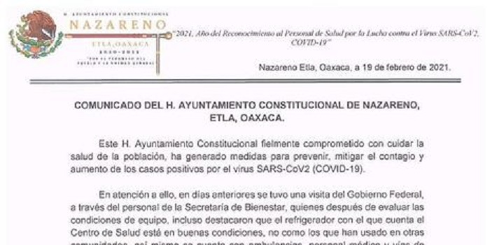 Redacción/Barra Informativa/Oaxaca, 19 de febrero 2021.- Integrantes del Ayuntamiento de el municipio de Nazareno, Etla, Oaxaca, hicieron pública su inconformidad por el cambio de sede del puesto de vacunación programado en esa población, y que sin justificación alguna se les informó que se instalaría en otra demarcación. En un comunicado hecho público este día, los representantes de la comunidad, encabezados por la presidenta municipal, señala que la modificación podría ser a qué ellos se rigen bajo el régimen de Sistemas Normativos Internos y que por darle un uso electoral se…
