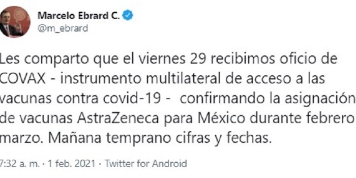 09:41 Emir Olivares Alonso |La Jornada |Ciudad de México. México recibirá entre febrero y marzo las vacunas contra el Covid-19 desarrolladas por la farmacéutica británica AstraZeneca y la Universidad de Oxford, informó esta mañana el titular de la Secretaría de Relaciones Exteriores (SRE), Marcelo Ebrard Casaubón. El canciller mexicano detalló a través de sus redes sociales que esto se consiguió gracias al instrumento multilateral de acceso equitativo a los biológicos conocido como Fondo de Acceso Global para Vacunas Covid-19 (Covax, por sus siglas en inglés), que envió un oficio a las…