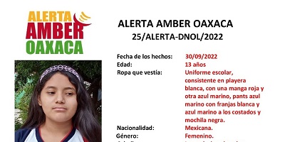 La Fiscalía General del Estado de Oaxaca (FGEO) solicita el apoyo de las y los representantes de los medios de comunicación a fin de que nos apoyen con la difusión de la presente ALERTA AMBER de la adolescente VICTORIA DEL CARMEN GARCÍA CUEVAS.
