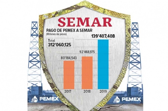 -Gasto aumentó 51% entre 2018 y 2019. -En los últimos tres años, la empresa del Estado pagó 312 millones de pesos a la Marina por el resguardo de sus instalaciones estratégicas. 24/02/2020 05:00 NAYELI GONZÁLEZ|Excélsior|CIUDAD DE MÉXICO. Con el fin de evitar daños por vandalismo y para combatir robos, entre 2017 y 2019, Petróleos Mexicanos (Pemex) pagó 312 millones 60.1 mil pesos a la Secretaría de Marina (Semar) para que vigile sus instalaciones estratégicas. El año pasado, la empresa productiva del Estado destinó más de 139 millones 407 mil pesos para…